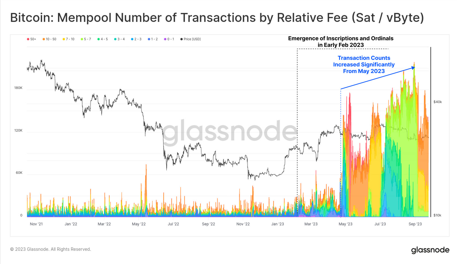 In a Sept 25 release, on-chain analytics firm Glassnode explained the role of BTC inscriptions on the network, their impact in competition with other transactions, and how they shape the mining industry.