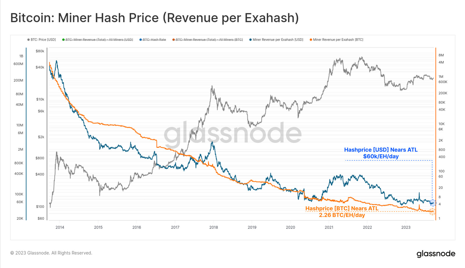 “This has driven the hash price, being the BTC or USD reward earned per Exahash, towards new all-time-lows. Miners will now earn just 2.26 BTC (~$60k) per Exahash active on the network,” the report reads.